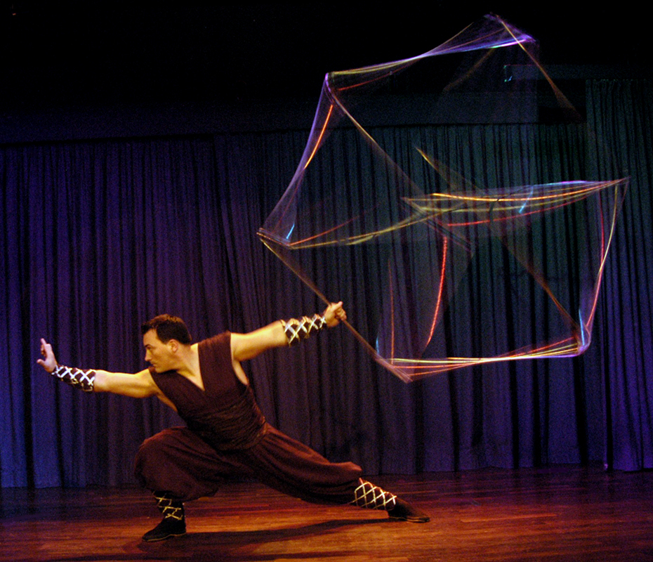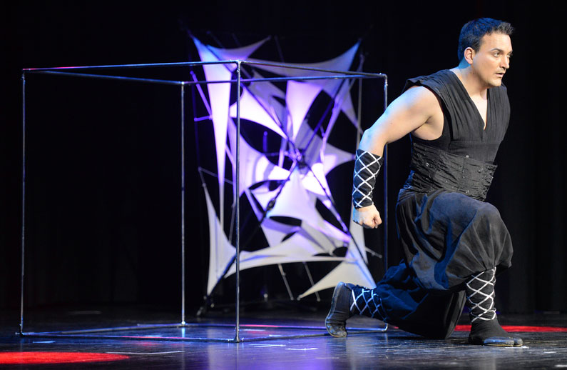 Kraftakrobatik und magische Kubusrotation. Diese dynamische Bewegungsperformance vereint artistische Höchstleistung, geschmiedeten Stahl und seidige Tücher zu einem Gesamtkunstwerk. Der Artist dreht den Würfel um seinen Körper und zeigt damit und darauf akrobatische Figuren.